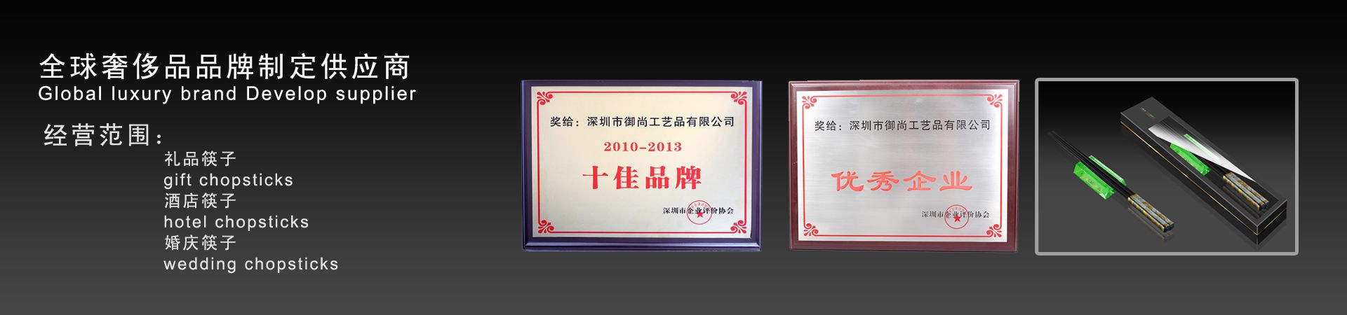 御尚健康產業(深圳)有限公司旗下御尚工藝筷子榮獲深圳市企業評價協會授予的2013年度“優秀企業”和年度“十佳品牌獎”稱號。 深圳市御尚工藝品前身為深圳市御尚工藝筷子廠,是御尚健康產業(深圳)有限公司和香港御尚實業有限公司全資子公司,是一家專業從事高檔筷子及紅木工藝品設計,研發和銷售及生產為一體的專業供應商,位...【更多詳情】